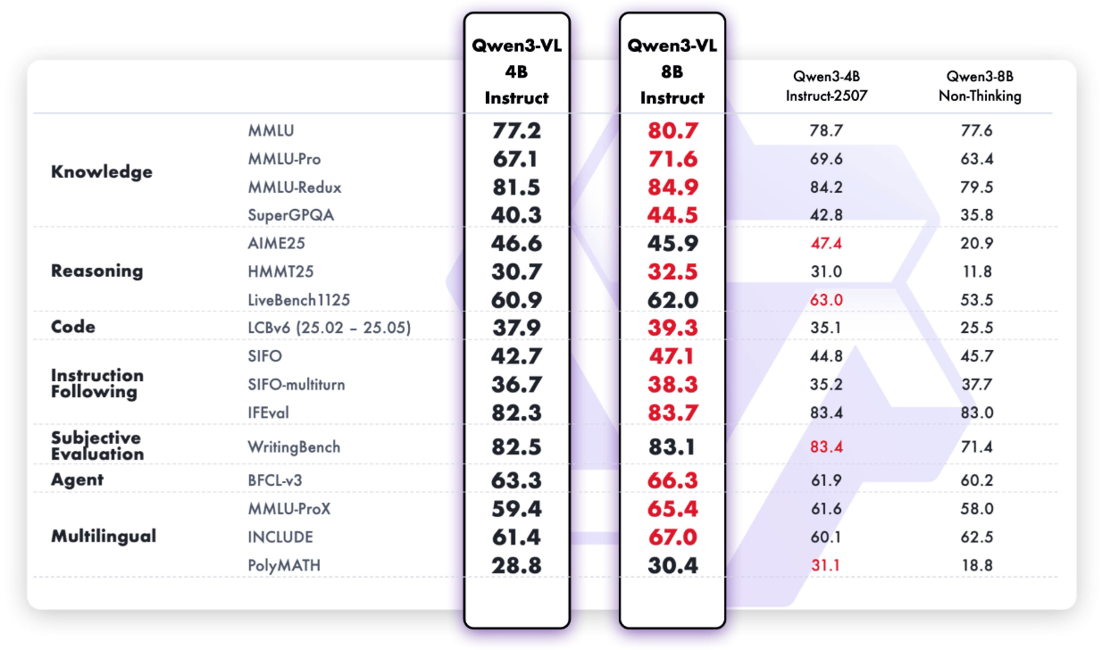 Alibaba introduces smaller 4B and 8B Qwen3-VL models that retain full multimodal capabilities while slashing VRAM demands. Despite their reduced size, these models outperform Gemini 2.5 Flash Lite and GPT-5 Nano in areas like STEM reasoning, OCR, video understanding, and agent tasks—sometimes even rivaling the 72B flagship from six months ago. FP8 versions further optimize deployment efficiency.