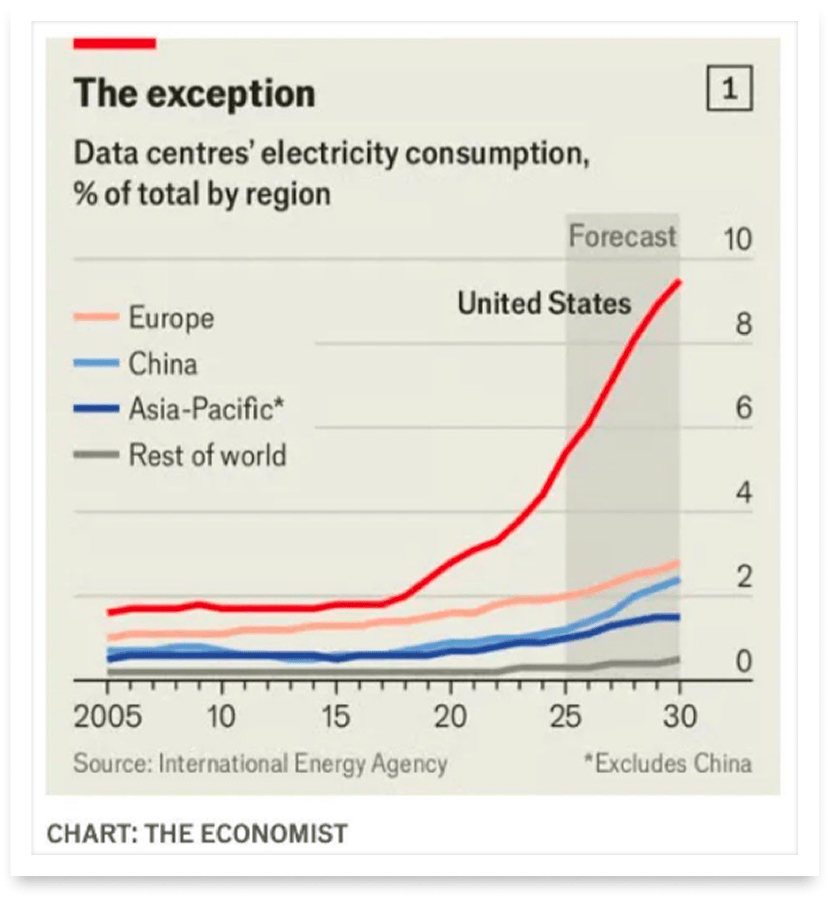 US data centers will consume nearly 10% of the entire US power grid by 2030. This is 4 times the percentage seen in China.