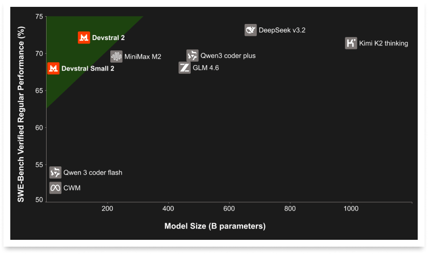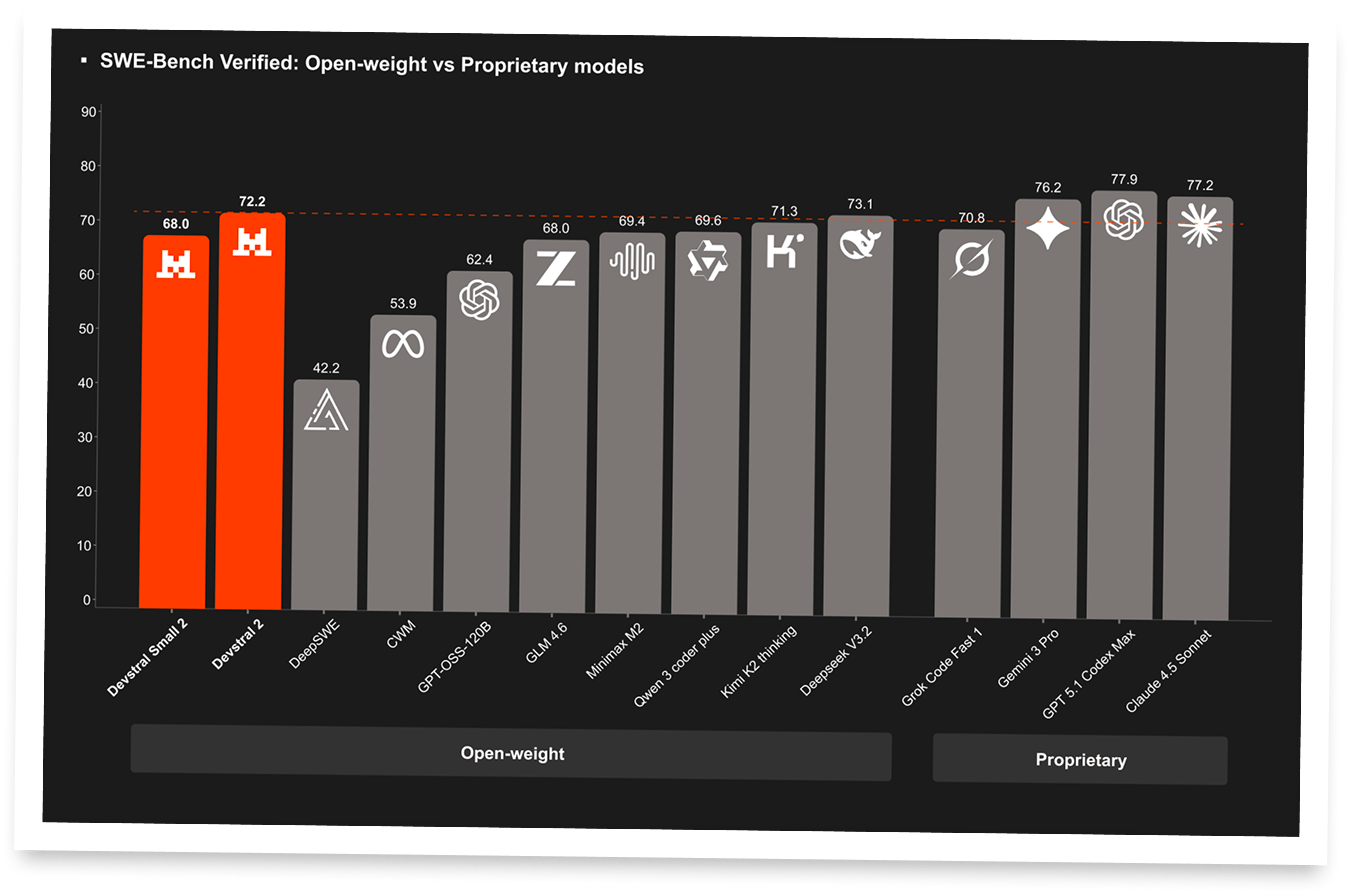 Mistral just dropped Devstral 2, a new family of open-weight coding models built to actually ship software, not just autocomplete snippets. The lineup comes in two sizes - Devstral 2 with 123B parameters and Devstral Small 2 with 24B - both released under permissive licenses (modified MIT and Apache 2.0) so teams can run, fine-tune, and redistribute them without being handcuffed to a single vendor. Devstral Small 2 posts 68% on SWE-Bench Verified and competes with models up to five times its size, while both variants stay dramatically smaller than giants like DeepSeek V3.2 and Kimi K2, making serious agentic coding feasible on far more modest hardware.